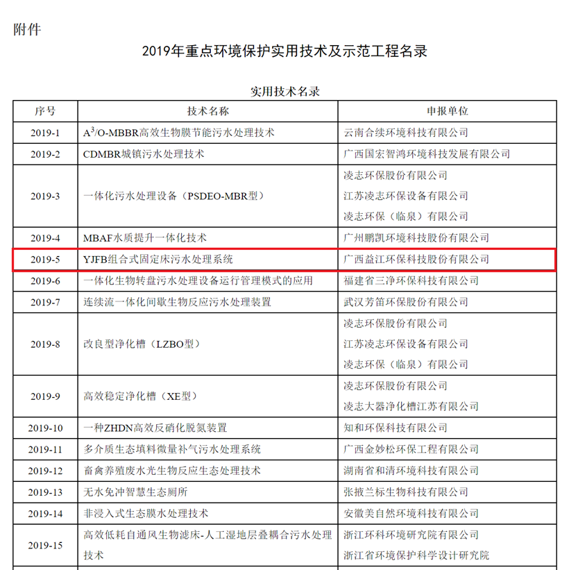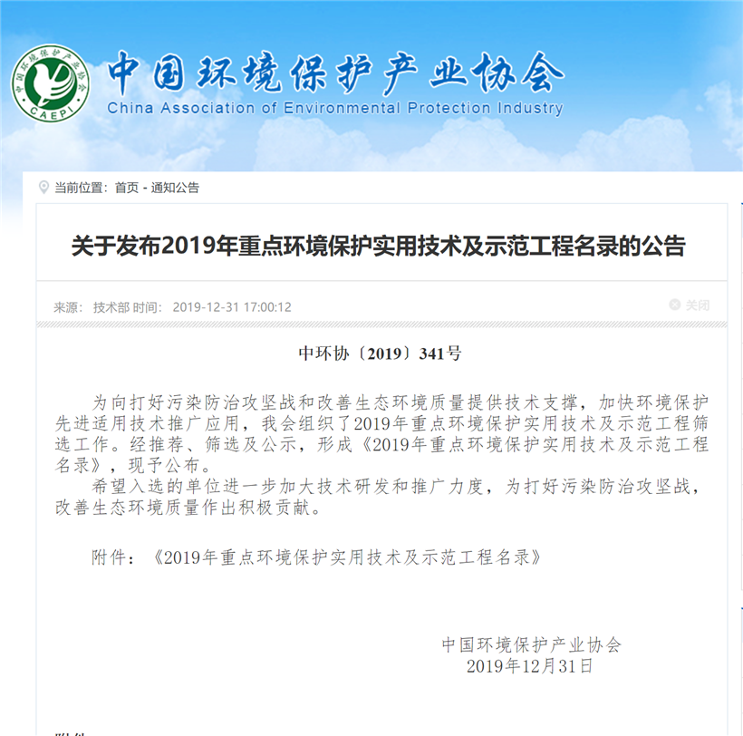 2019年12月31日,中国环境保护产业协会发布《2019年重点环境保护实用技术及示范工程名录的公告》,欧亿-中国一站式体育服务平台农村污水“YJFB组合式固定床污水处理系统技术”入选名录(全国共45项)。这是公司继乡镇污水处理MC-MBBR核心技术2016年入选重点环境保护实用技术及示范工程后,又一自主研发的分散式污水处理技术获得国家及行业认可。