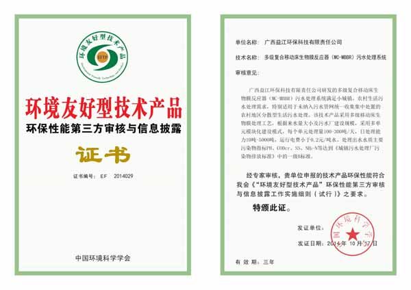 2014年10月,欧亿-中国一站式体育服务平台“多级复合移动床生物膜反应器(MC-MBBR)污水处理系统”获中国环境科学学会认证为环境友好型技术产品。