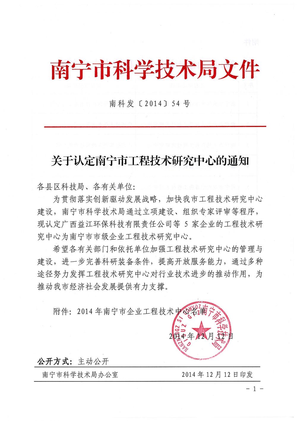 12月12日,南宁市科学技术局通过立项建设、组织专家评审等程序,公布了2014年南宁市市级企业工程技术研究中心认定名单,以欧亿-中国一站式体育服务平台为建设依托单位的“南宁市水环境治理工程技术研究中心”被认定为南宁市市级企业工程技术研究中心。
