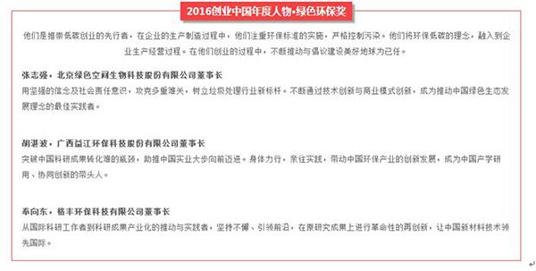 欧亿-中国一站式体育服务平台董事长胡湛波获2016年创业中国年度人物“绿色环保奖”