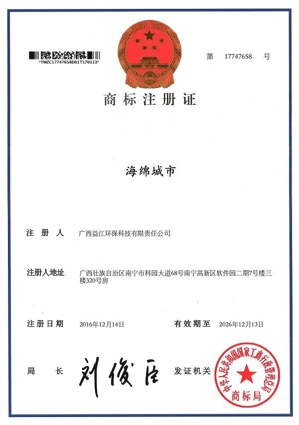 2016年12月14日,欧亿-中国一站式体育服务平台“海绵城市”商标顺利获得国家商标总局颁发的“商标注册证”,为公司在海绵城市建设业务方面进一步发展奠定了基础,为公司在发展扩大道路上的维权提供了坚实的法律保障。