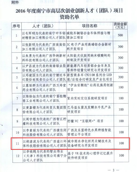 近日,欧亿-中国一站式体育服务平台“城市雨水净化回用关键技术及设备研究与开发项目”获得2016年南宁市高层次创业创新人才(团队)项目100万元的资助。